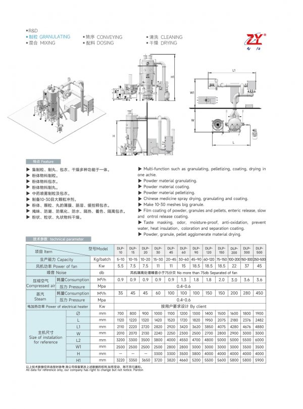 ※DLP Granulator/Coater/Pelleter is multi-function equipment integrated spray drying-granulating-centrifugal spray coating-fluid coating-drying in one body. The machine combined various process operations. Particularly it is suitable for granulating, pelleting and coating of various varieties in pharmaceutical industry, foodstuff industry and chemical industry,
