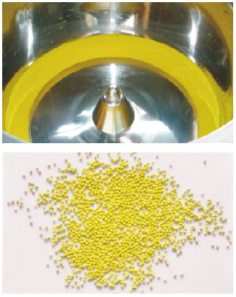 将前道工序制得的湿颗粒投入旋转离心盘内,启动鼓风机后,离心盘同步旋转。湿颗粒在环隙空气浮力、旋转离心力与自身重力的协同作用下,呈环周绳股状运动,经高速滚圆形成真球度极高的球丸。