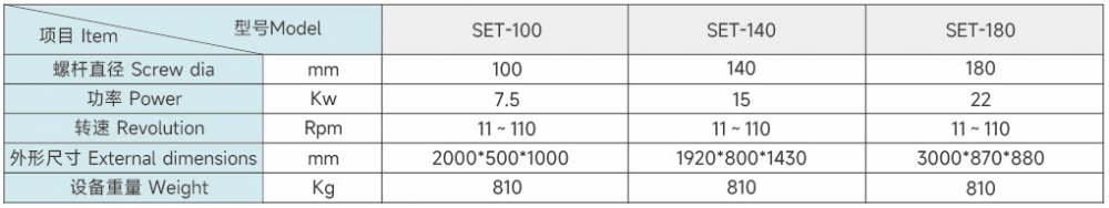 SET系列螺杆挤压造粒机有SET-100、SET-140、SET-180型号可供选择。