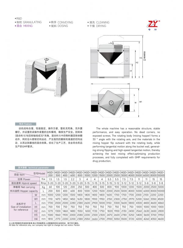 It can automatically complete ascension, clamping, mixed , drop all the action. Mixing hopper with a single arm lifting hopper mixer and a plurality of different specifications, can meet the mixed batch, multi varieties, is the ideal equipment for Pharmaceutical General mixed.