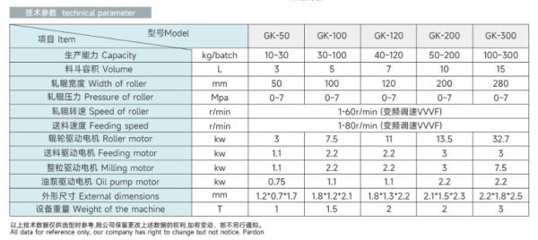 经配料混合好的干粉物料,由专用加料机(气动或机动)加入到上料斗内,经螺旋输送器输送到压力室,两个高压力挤压轮将物料压制成高密度薄片,通过切制系统切制成小块,经由两级整粒系统制成要求大小的颗粒,完成制粒过程。